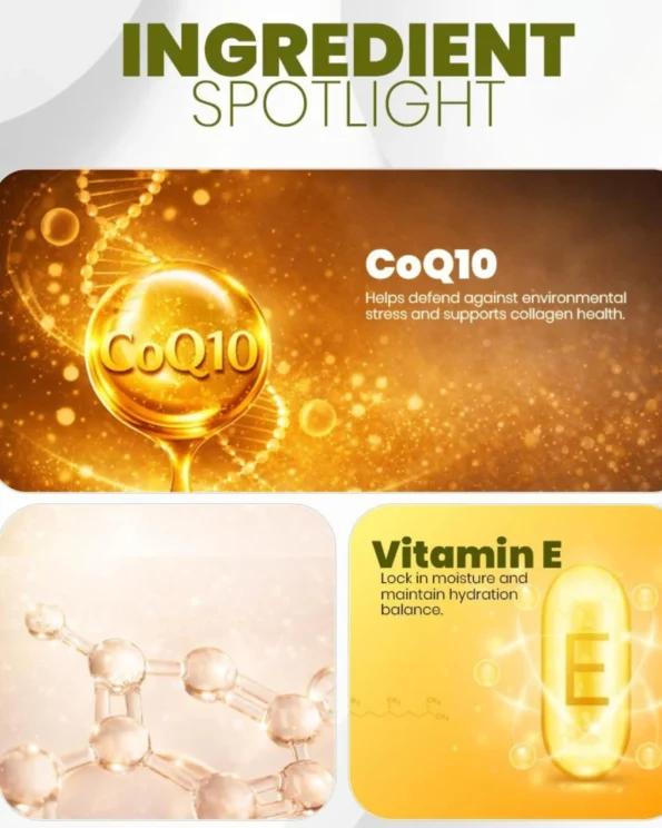This formulation works through antioxidant defense and skin renewal support. Coenzyme Q10 helps energize skin cells and improve their repair capacity, while Vitamin E protects against external stressors and maintains moisture balance. Together, they help reduce visible signs of damage and improve overall skin health.